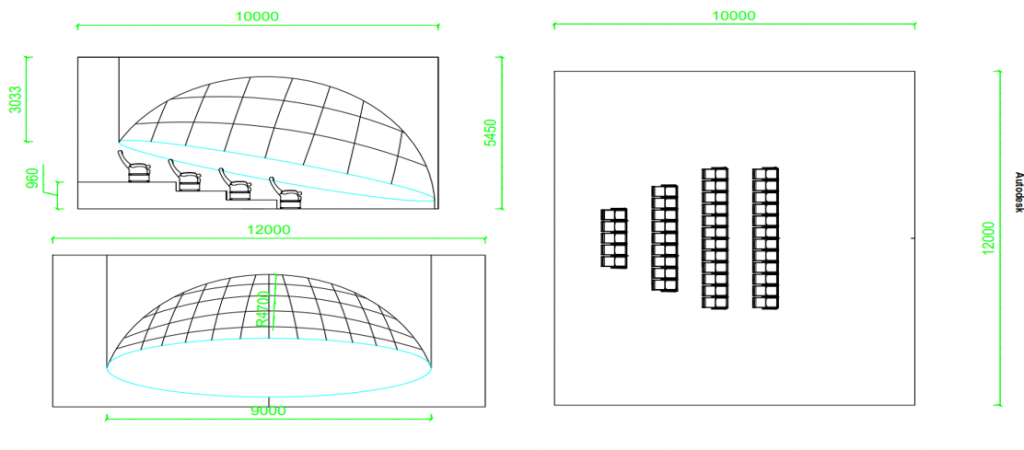 Our dome theater product has a width of 9.4 meters and an installation height of 9 meters. It is a non-traditional hemispherical shape and can accommodate 38 people. The spherical screen is made of microporous anti-rust aluminum plate, which is made by longitudinal docking and upper and lower overlap processes; it uses professional equipment and special processes such as galvanized rectangular tubes and angle steel. The warp axis and cross beam are made of galvanized rectangular tubes, and the weft axis is made of galvanized rectangular tubes; the ring beam, ground beam and support rod are all made of Q235 material. This is a high-tech system engineering that integrates sound, light, electricity, automatic control and computer animation.
