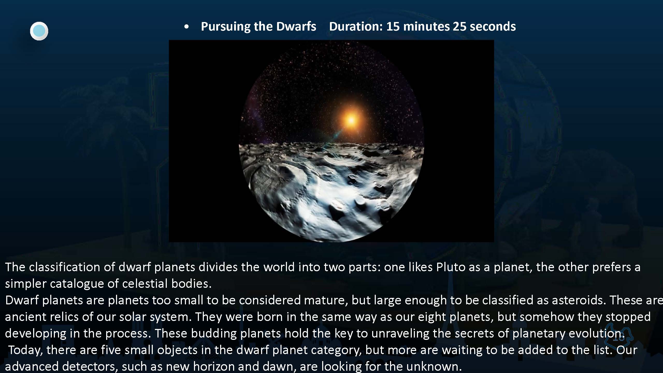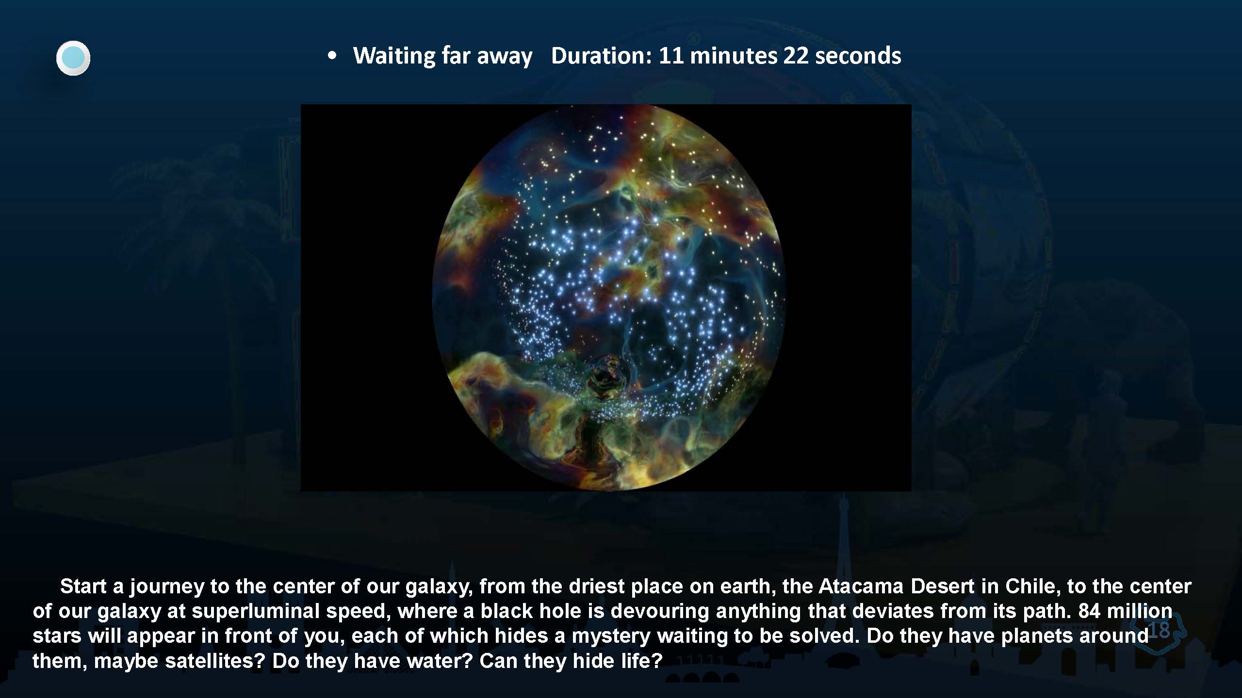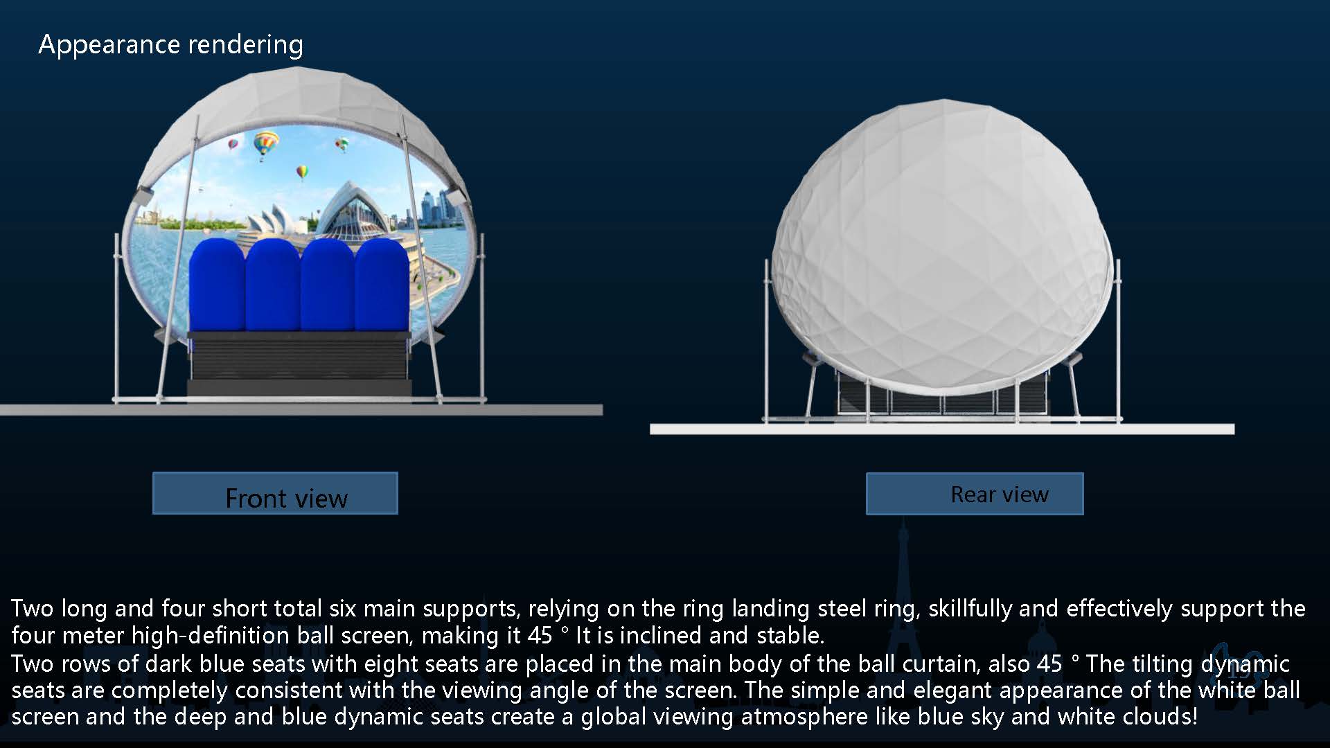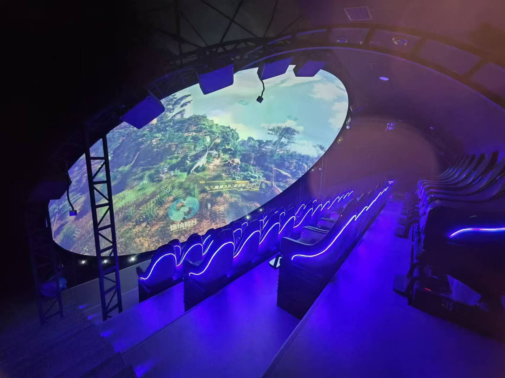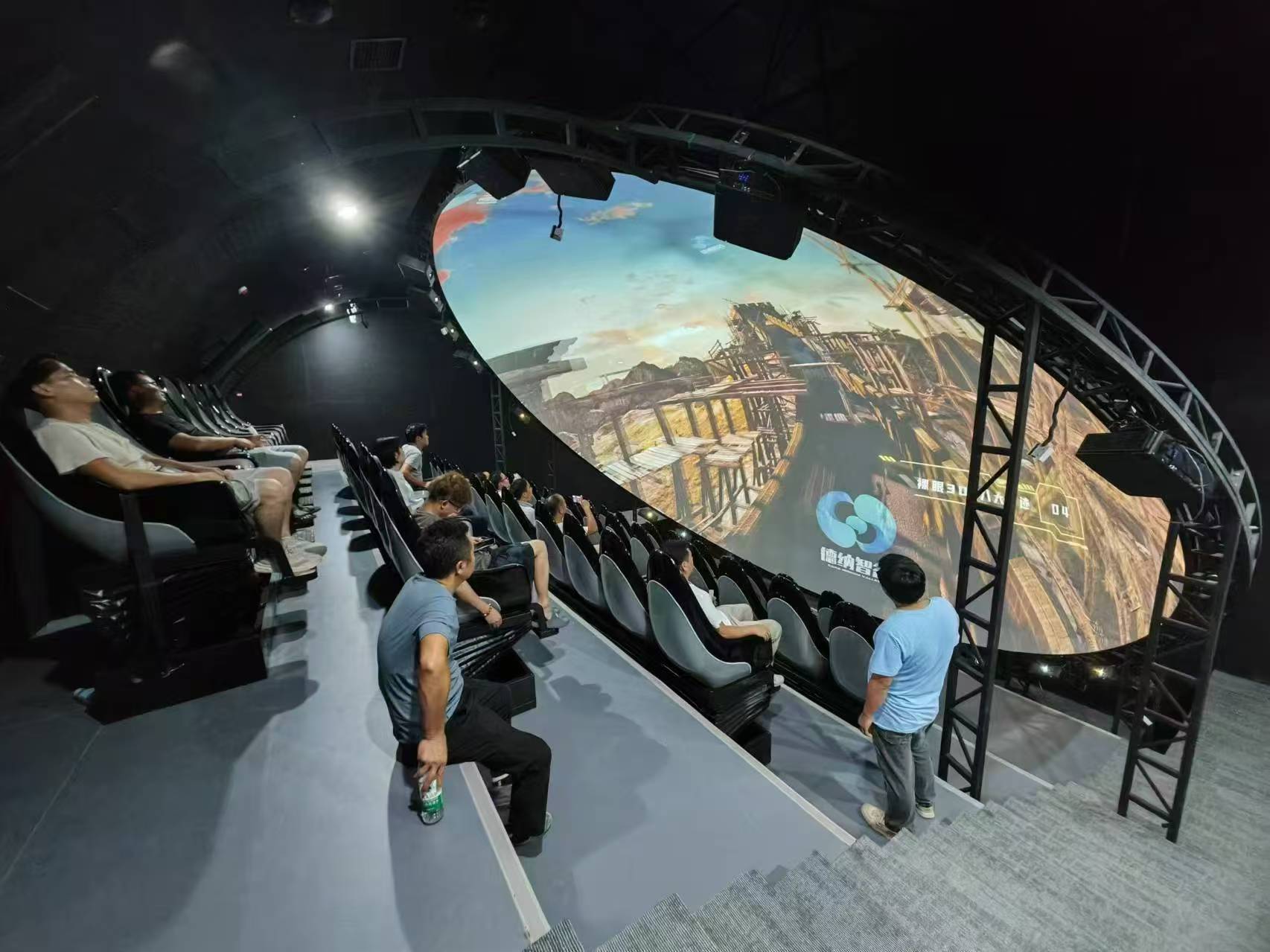 The dome theater is an immersive viewing device composed of a dome structure, a projection system and a dynamic seat system, which brings an immersive viewing experience to the audience. The whole presents a huge hemisphere placed on the ground. The projection form designs the screen into a hemispherical shape, and the vast universe presented on the screen surrounds the audience. The field of view can reach 360°, with stereo surround sound. The audience sits on the platform to watch the movie, as if they are in a space roaming, or diving into the water to enjoy the strange sights of the underwater world.