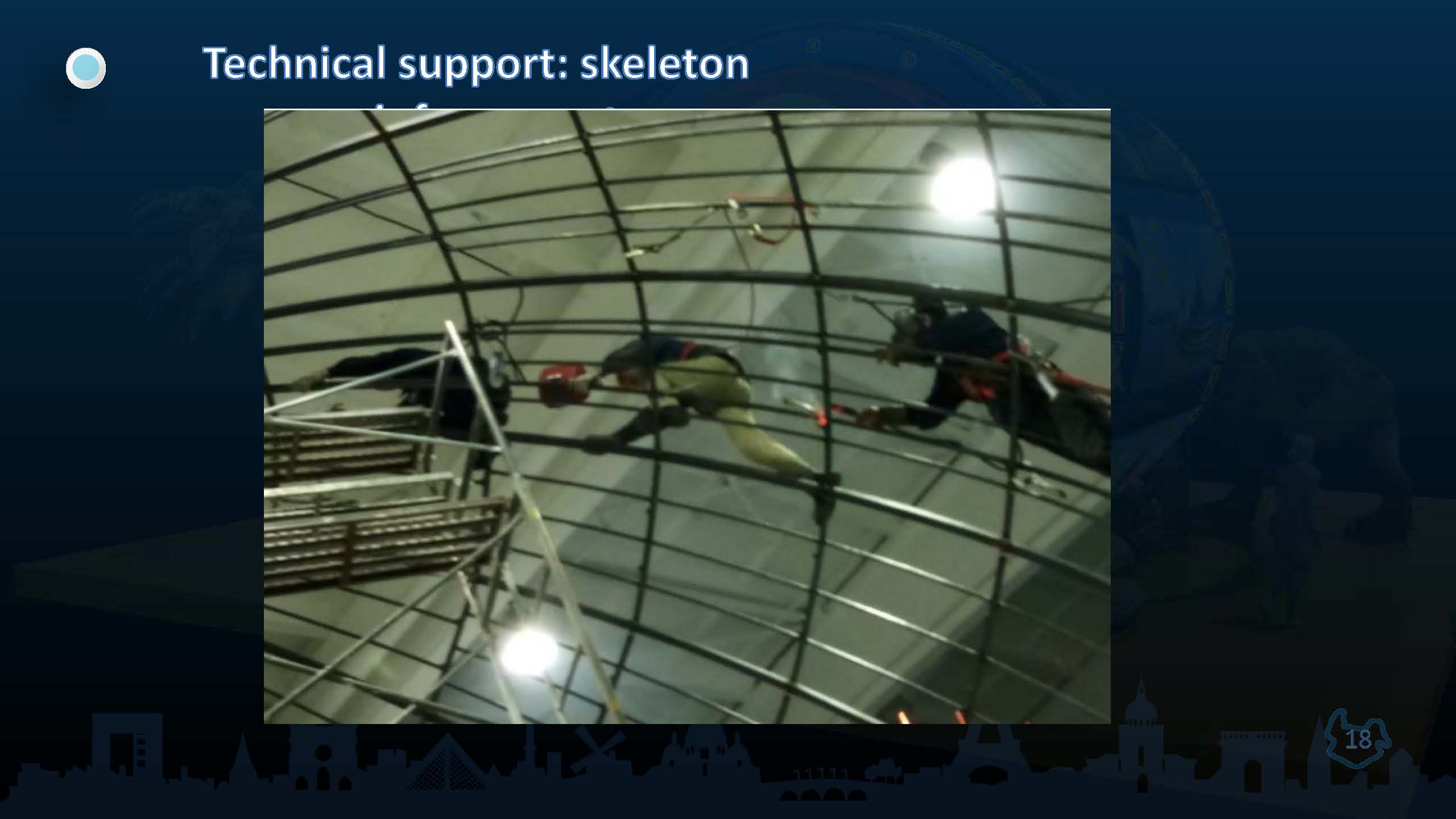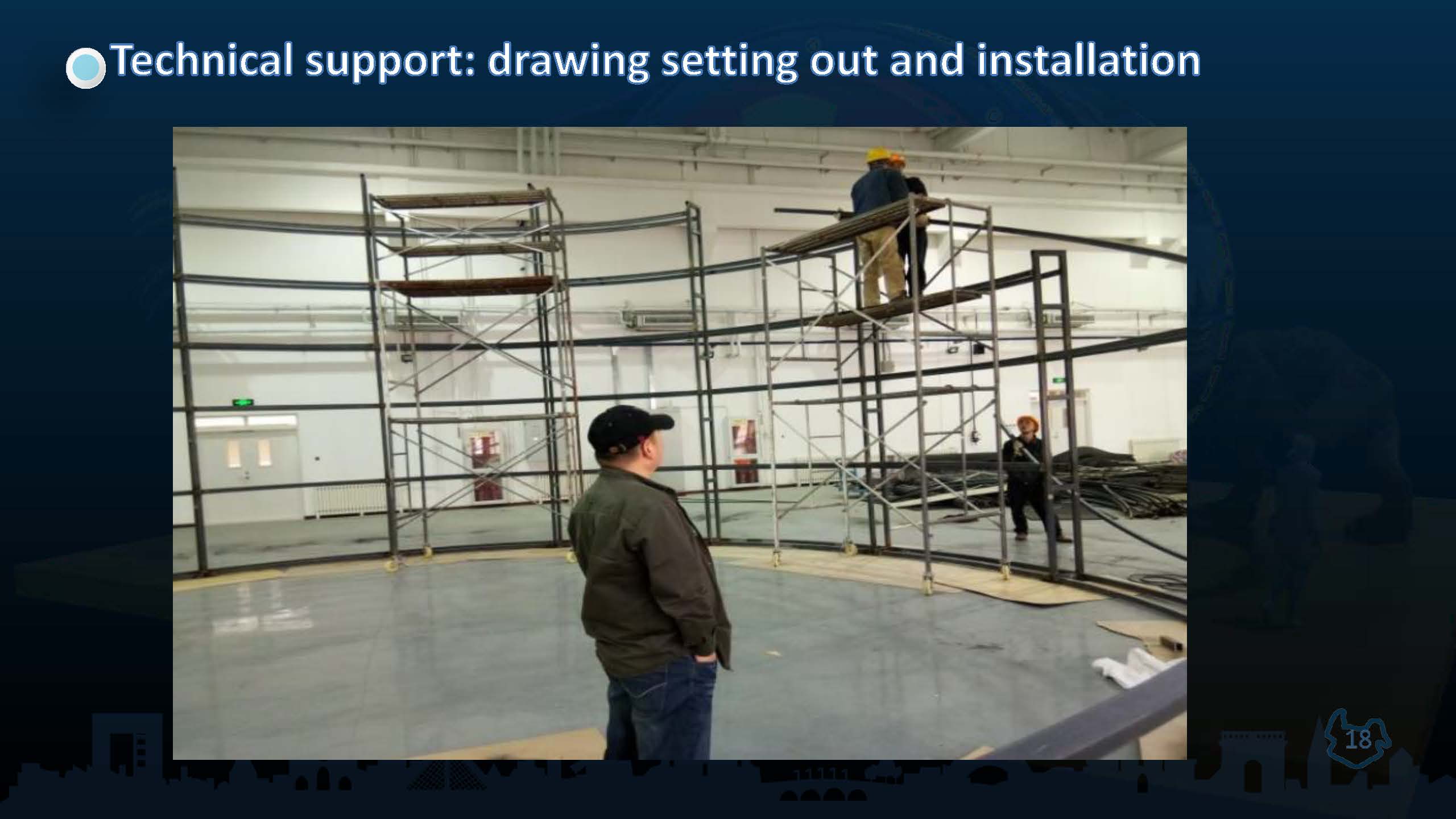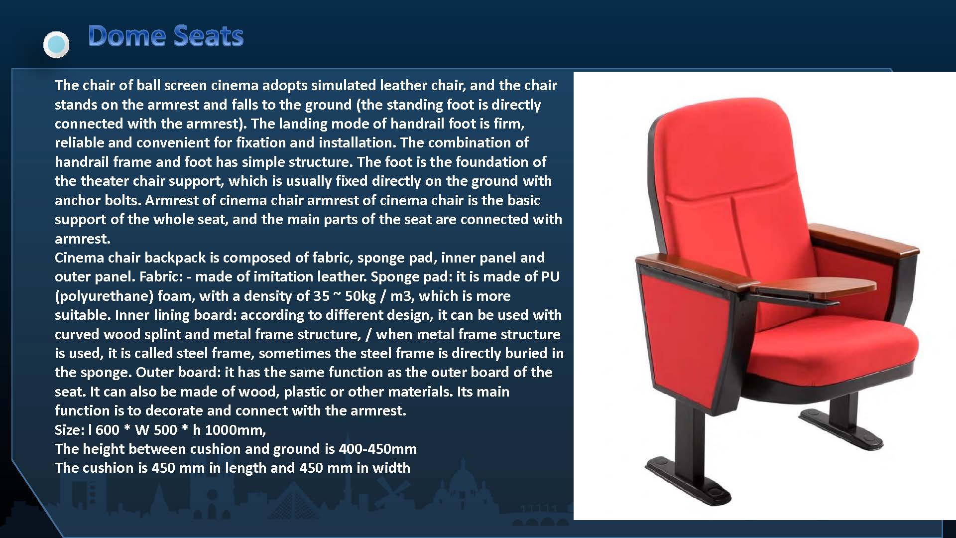 Our dome theater product has a width of 9.4 meters and an installation height of 9 meters. It is a non-traditional hemispherical shape and can accommodate 38 people. The spherical screen is made of microporous anti-rust aluminum plate, which is made by longitudinal docking and upper and lower overlap processes; it uses professional equipment and special processes such as galvanized rectangular tubes and angle steel. The warp axis and cross beam are made of galvanized rectangular tubes, and the weft axis is made of galvanized rectangular tubes; the ring beam, ground beam and support rod are all made of Q235 material. This is a high-tech system engineering that integrates sound, light, electricity, automatic control and computer animation.